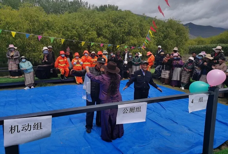 熱情洋溢的歌舞、考驗團(tuán)結(jié)的拔河比賽、充滿濃烈民族色彩的抱石頭、翻桶比賽......平時樸素的環(huán)衛(wèi)工作者們紛紛脫下了沉悶的工作服,穿上了華美的藏袍,伴隨著精彩的活動,大家或是跳舞唱歌,嘻嘻鬧鬧;或是三五成群,談笑風(fēng)生,整場活動高潮迭起、笑聲不斷。